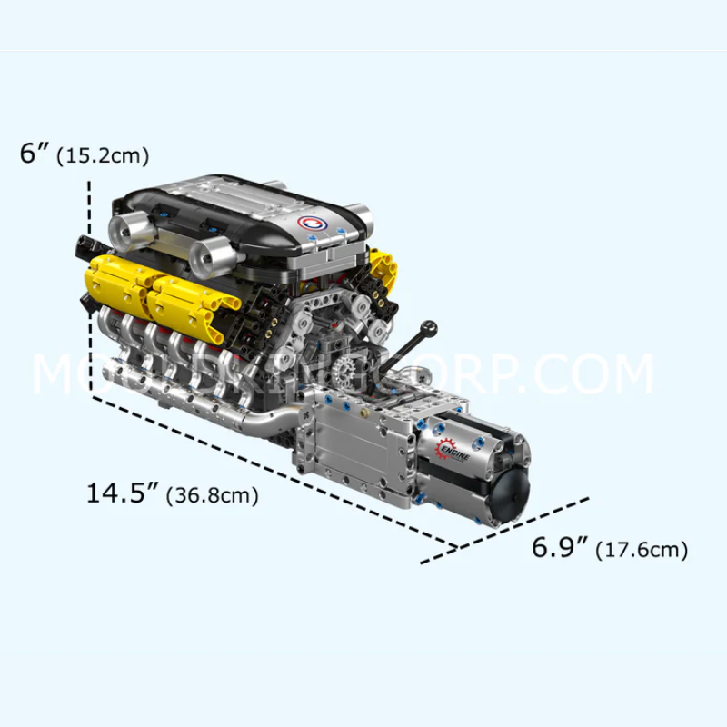 Depois de montado, o modelo vira uma peça de exposição técnica, perfeita para quem curte mecânica, Mould King e Technic. O motor mede aproximadamente 37 cm de comprimento, 16 cm de altura e 18 cm de largura, ocupando um bom espaço de destaque em prateleiras, mesas de escritório ou oficinas decoradas.