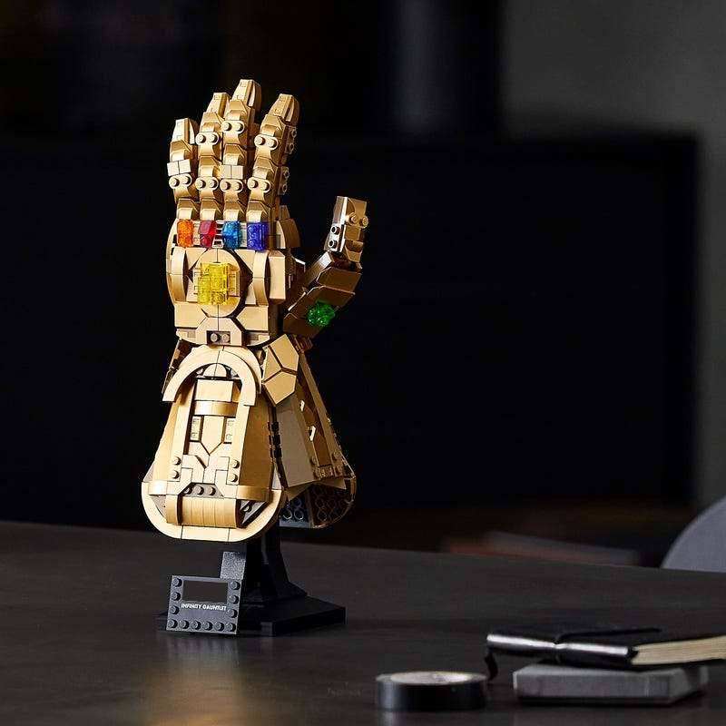 Réplica em blocos da Manopla do Infinito, com as seis Joias do Infinito em cores vibrantes