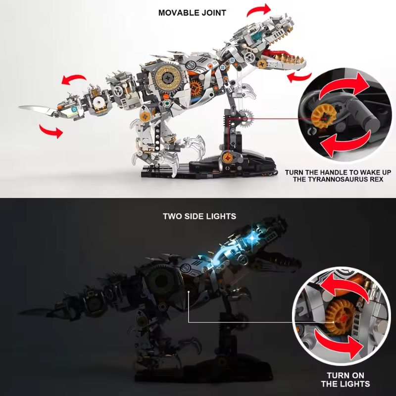 Modelo T-Rex mecânico em blocos de montar, com visual de dinossauro “mecha” futurista