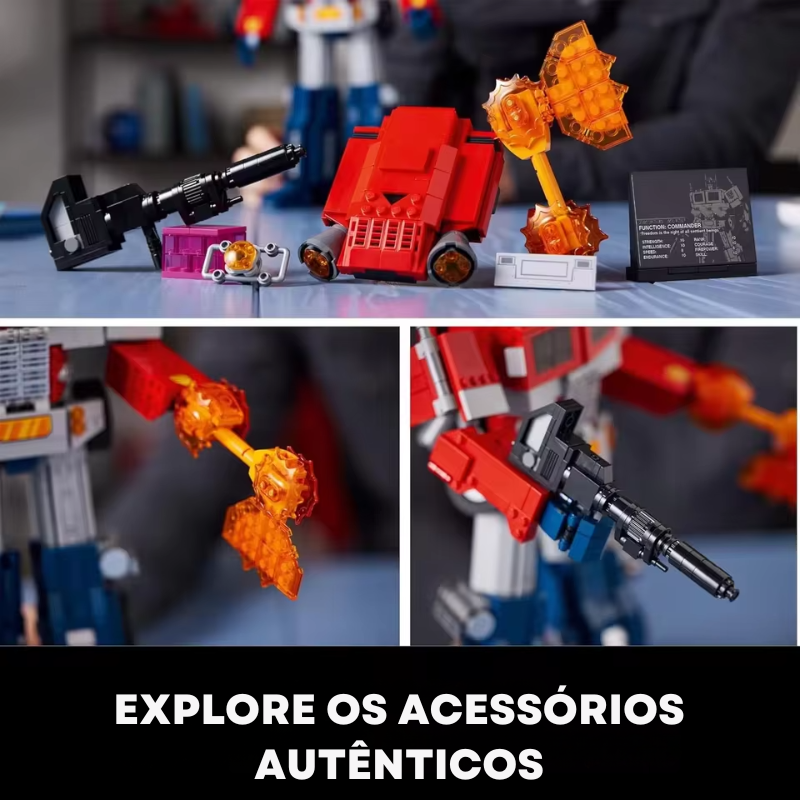 Com 1.508 peças, é um projeto pensado para adultos e colecionadores: construção cheia de técnicas avançadas, 19 pontos de articulação no modo robô e presença marcante na prateleira. Depois de montado, o Optimus fica com cerca de 35 cm de altura em modo robô, e aproximadamente 15 cm de altura, 27 cm de comprimento e 12 cm de largura em modo caminhão.