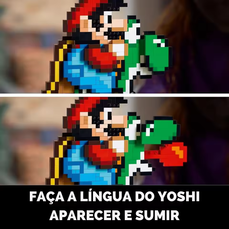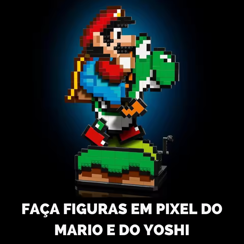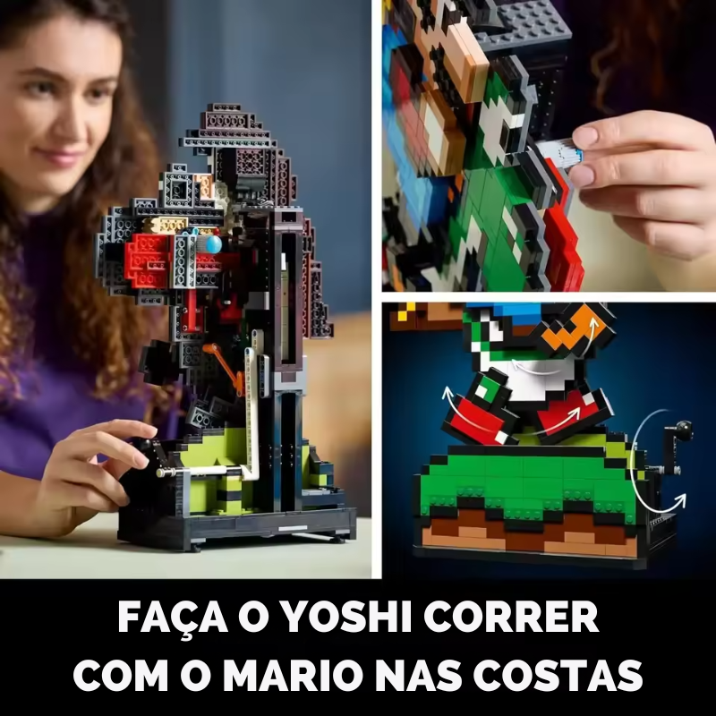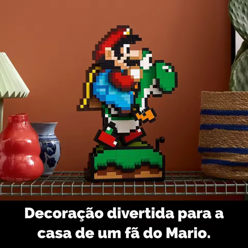 O set Super Mario World Mario e Yoshi em blocos de montar é um modelo de exposição pensado para adulto que cresceu nos games da era 16-bit. Ele recria em estilo pixelado o Mario montado no Yoshi, com efeito de corrida acionado por manivela e a clássica sensação de fase side-scroll da Nintendo.