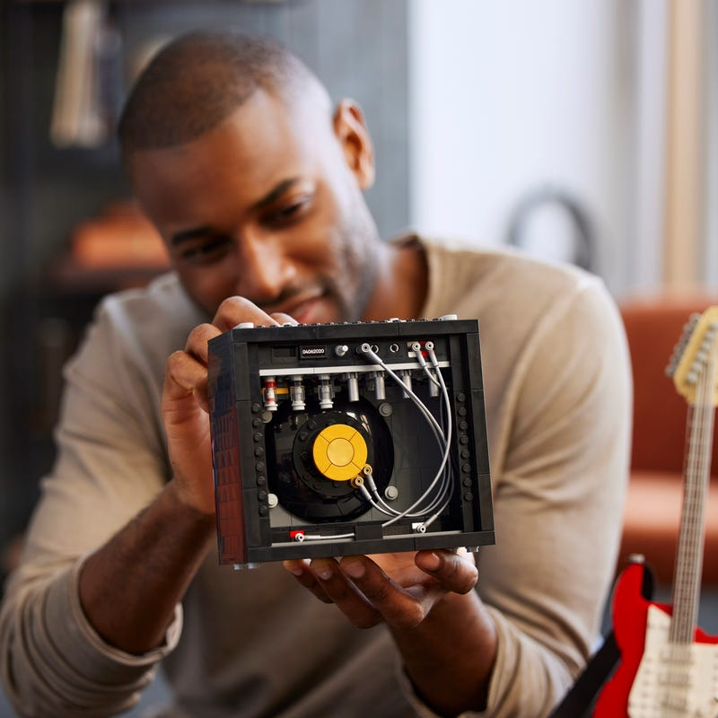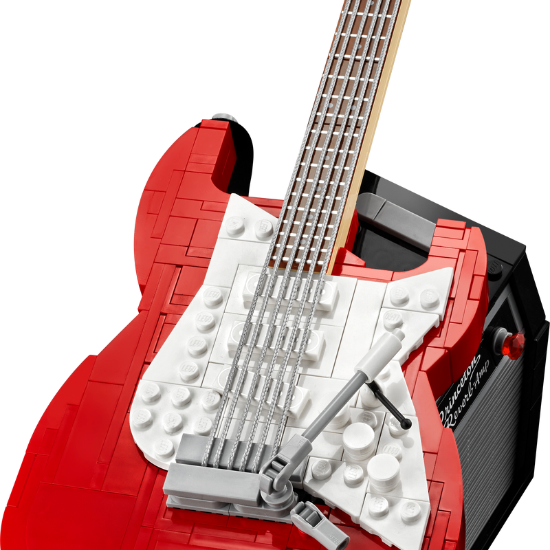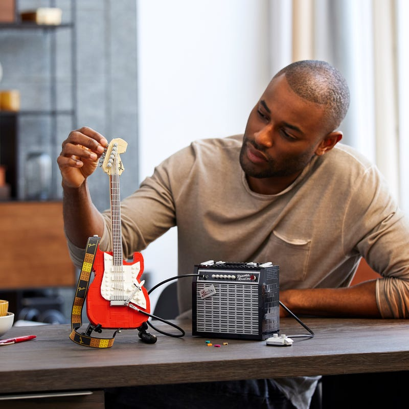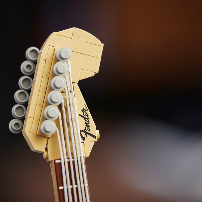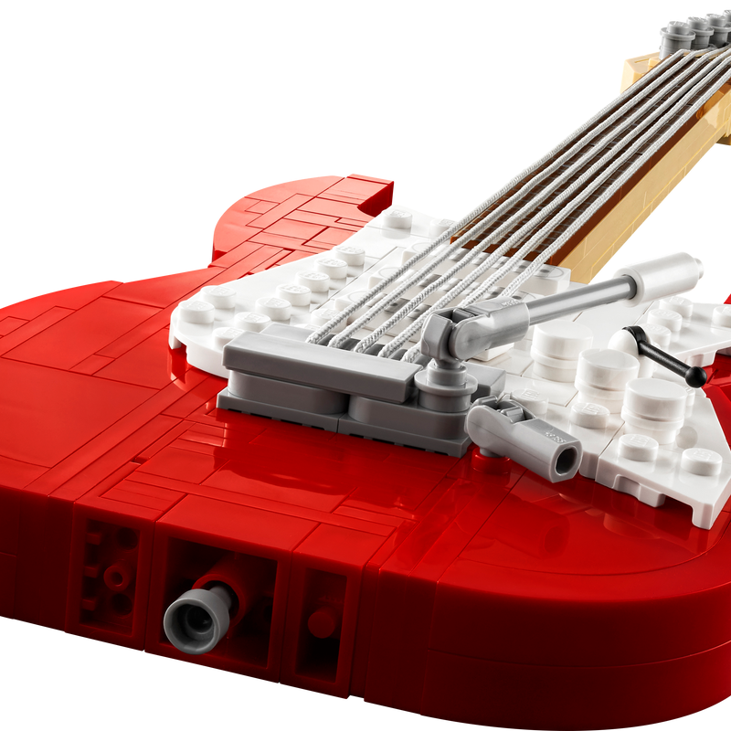 A Guitarra Fender Stratocaster em blocos de montar é um daqueles modelos que viram peça de destaque em qualquer coleção. Inspirada no set LEGO Ideas Fender Stratocaster 21329, ela recria a clássica Strat dos anos 70 com corpo detalhado, headstock característico e visual de guitarra real de estúdio.