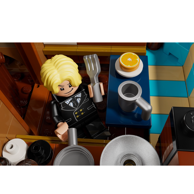 O modelo traz interiores completos: cabine da tripulação, cozinha, área de armazenamento e oficina, permitindo montar cenas que remetem diretamente ao anime/série live action. Montado, o navio fica com aproximadamente 34 cm de altura, 39 cm de comprimento e 20 cm de largura, seguindo as especificações oficiais do set equivalente – presença forte em qualquer estante, rack ou setup otaku.