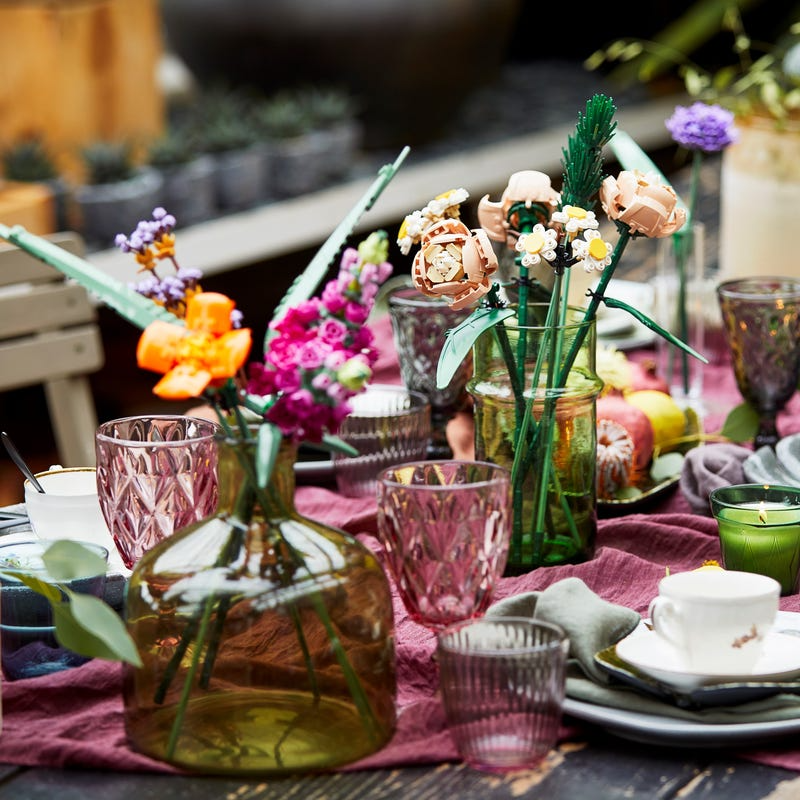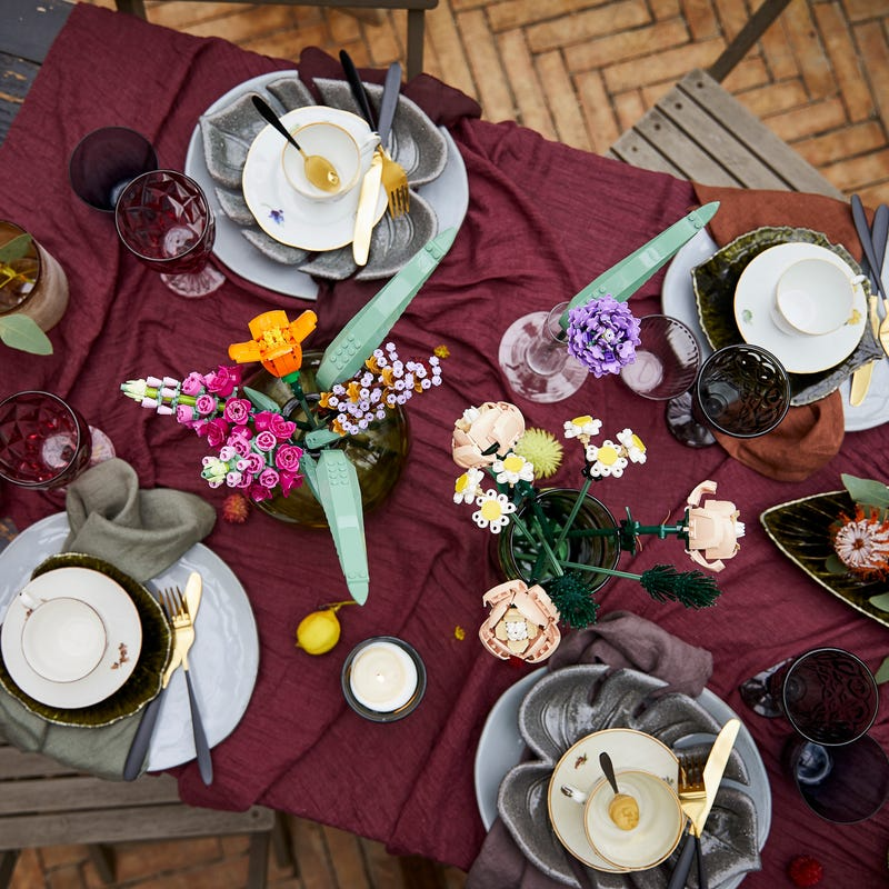 Com 756 peças, a montagem é relaxante, quase meditativa: você constrói haste por haste, ajusta alturas, combina flores e monta um buquê totalmente customizável. Diferente de flores naturais, aqui o arranjo não murcha, não precisa de água e pode ser remodelado quantas vezes você quiser.