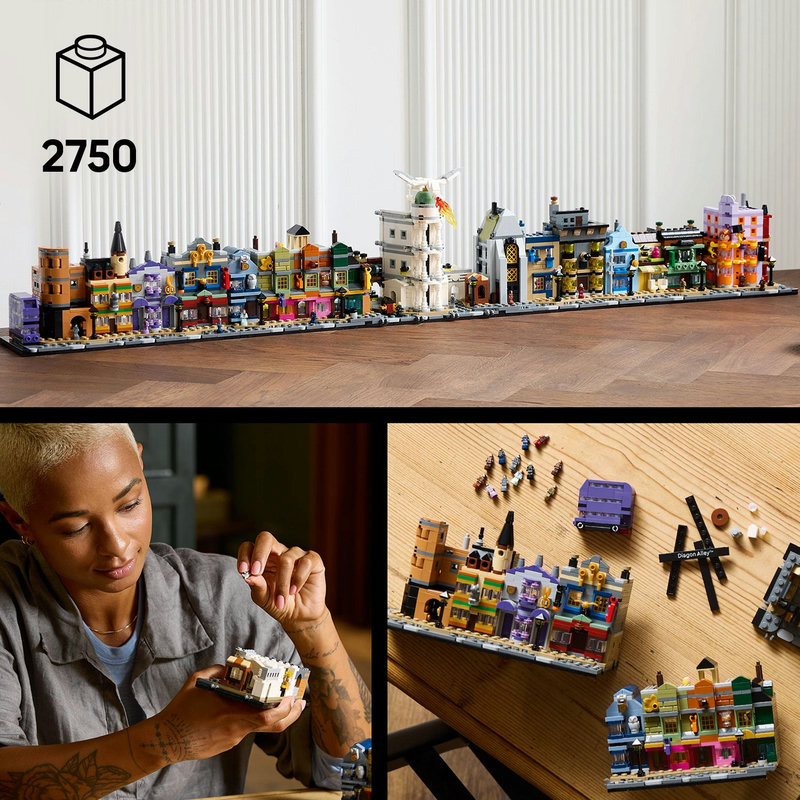 Este conjunto inspirado no icônico Beco Diagonal foi criado para colecionadores que buscam uma experiência de montagem rica, cheia de detalhes e com forte presença visual. Com 2.750 peças, cada etapa revela fachadas mágicas, vitrines encantadas, texturas arquitetônicas e elementos clássicos do mundo bruxo. O resultado final não é apenas um modelo — é uma peça de destaque na coleção, com atmosfera imersiva, acabamento premium e a certeza de que quem vê, admira.
