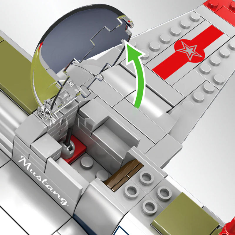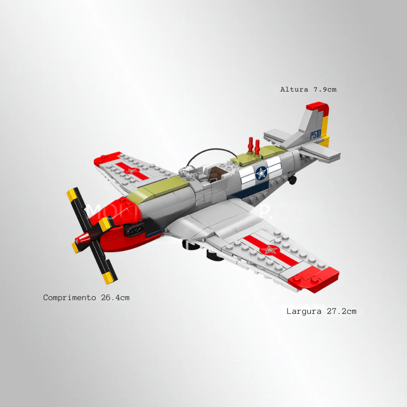 O P-51D Mustang Fighter é uma homenagem a um dos aviões de combate mais icônicos da história da aviação militar. Reconhecido por sua velocidade, elegância aerodinâmica e papel decisivo na Segunda Guerra Mundial, o Mustang ganha aqui uma versão em blocos de montar que combina nostalgia histórica com design técnico.