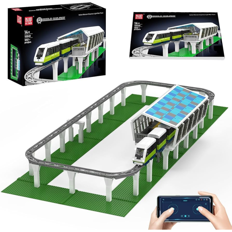 Construa um impressionante sistema ferroviário inspirado no moderno monotrilho italiano Marconi Express com este incrível conjunto da Mould King.